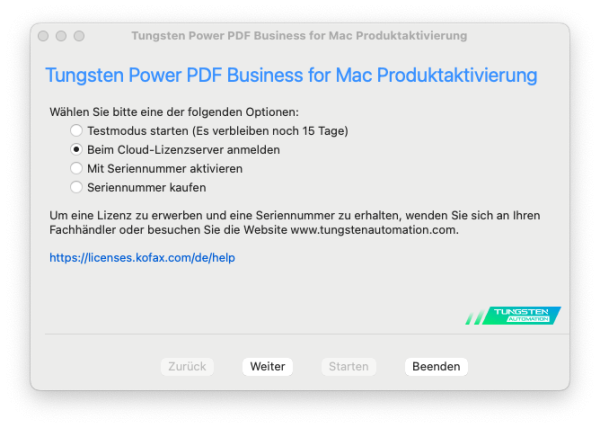 3. Wählen Sie hier: “Beim Cloud-Lizenzserver anmelden“