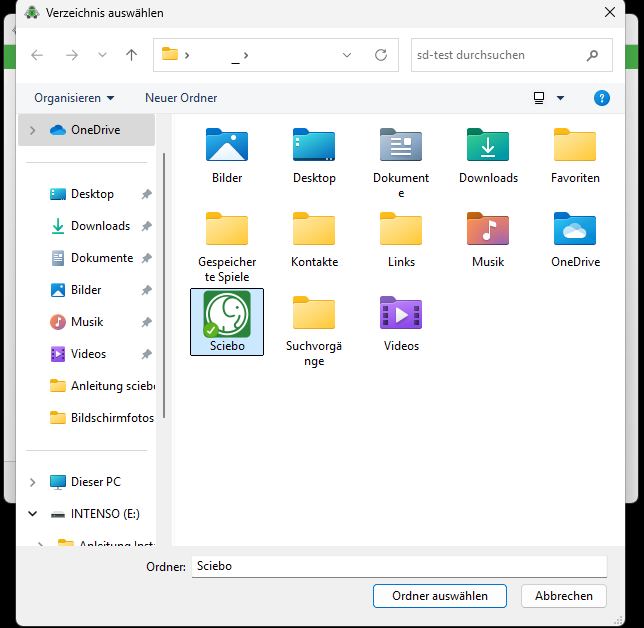 Den sciebo-Synchronisationsordner finden Sie auf Ihrer Festplatte unter "Benutzer" -> "Benutzername". Bestätigen Sie mit "Ordner auswählen".