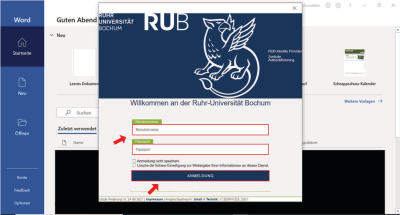 - Geben Sie nun Ihre persönliche RUB-LoginID und das dazugehörigen Passwort ein und klicken Sie auf „Anmelden“.